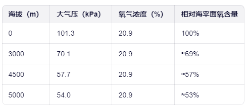 随着海拔升高,大气压力下降,空气中氧气分压随之降低: