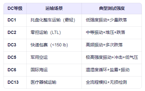 ASTM D4169的精髓在于 “基于风险的测试”(Risk-Based Testing)。它不规定统一的测试流程,而是根据产品的运输方式、环境、价值和风险等级,将运输过程划分为 13个运输等级(Distribution Cycle, DC1–DC13)