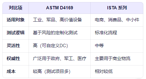 与针对电商小件的ISTA标准不同,ASTM D4169更强调系统性、可定制性和严苛性,适用于非标准化、高风险、长距离运输的场景。
