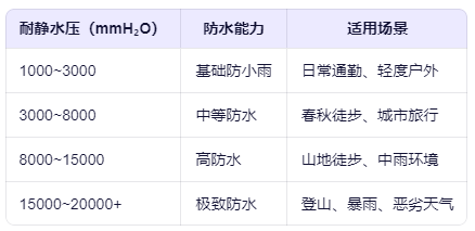 数值代表面料能承受多高的水柱而不渗水。例如,10000mm 意味着该面料可抵御10米高的水柱压力,远超一般暴雨强度。