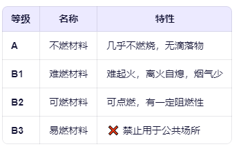 • 公共场所(地铁、医院、商场)必须使用 B1级及以上 阻燃材料。